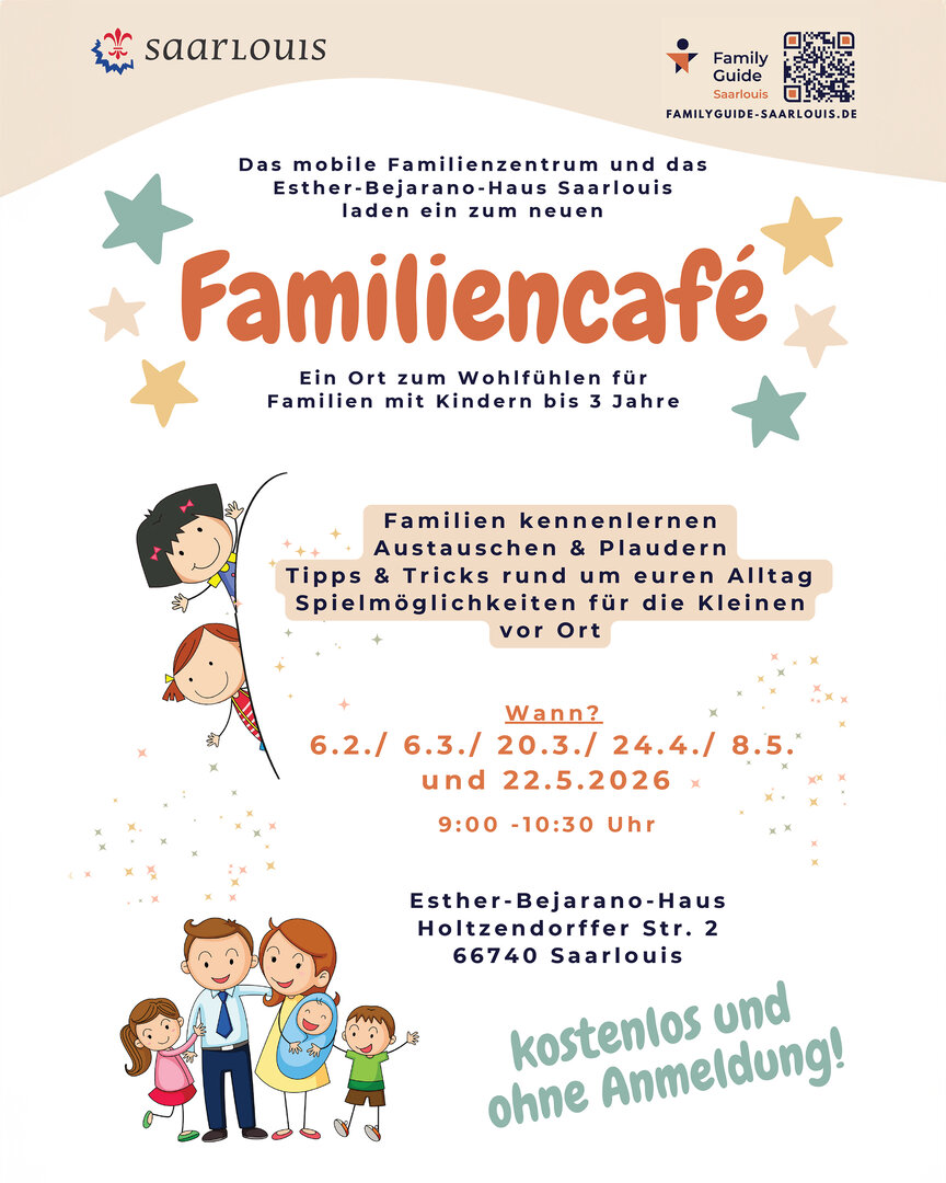 Am Freitag, 6. Februar 2026, läuft beim Mobilen Familienzentrum im Landkreis Saarlouis ein neues, kostenloses Angebot an: Von 9 Uhr bis 10:30 Uhr sind Familien mit Kindern im Alter von bis zu drei Jahren zum ersten Familiencafé im Esther-Bejarano-Haus, Holtzendorffer Straße 2, nach Saarlouis eingeladen.