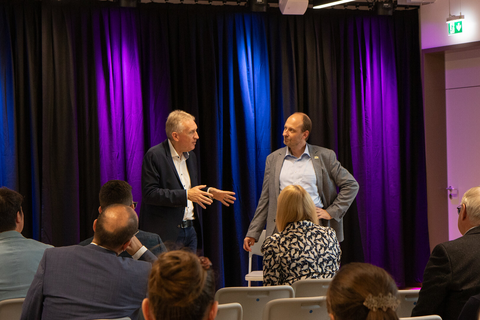 Begrüßung der Gäste durch den Schulleiter des Robert-Schuman-Gymnasiums, Uwe Peters sowie Landrat Patrik Lauer. (v.l.) Foto: Landkreis Saarlouis - David Nicola Schmitt