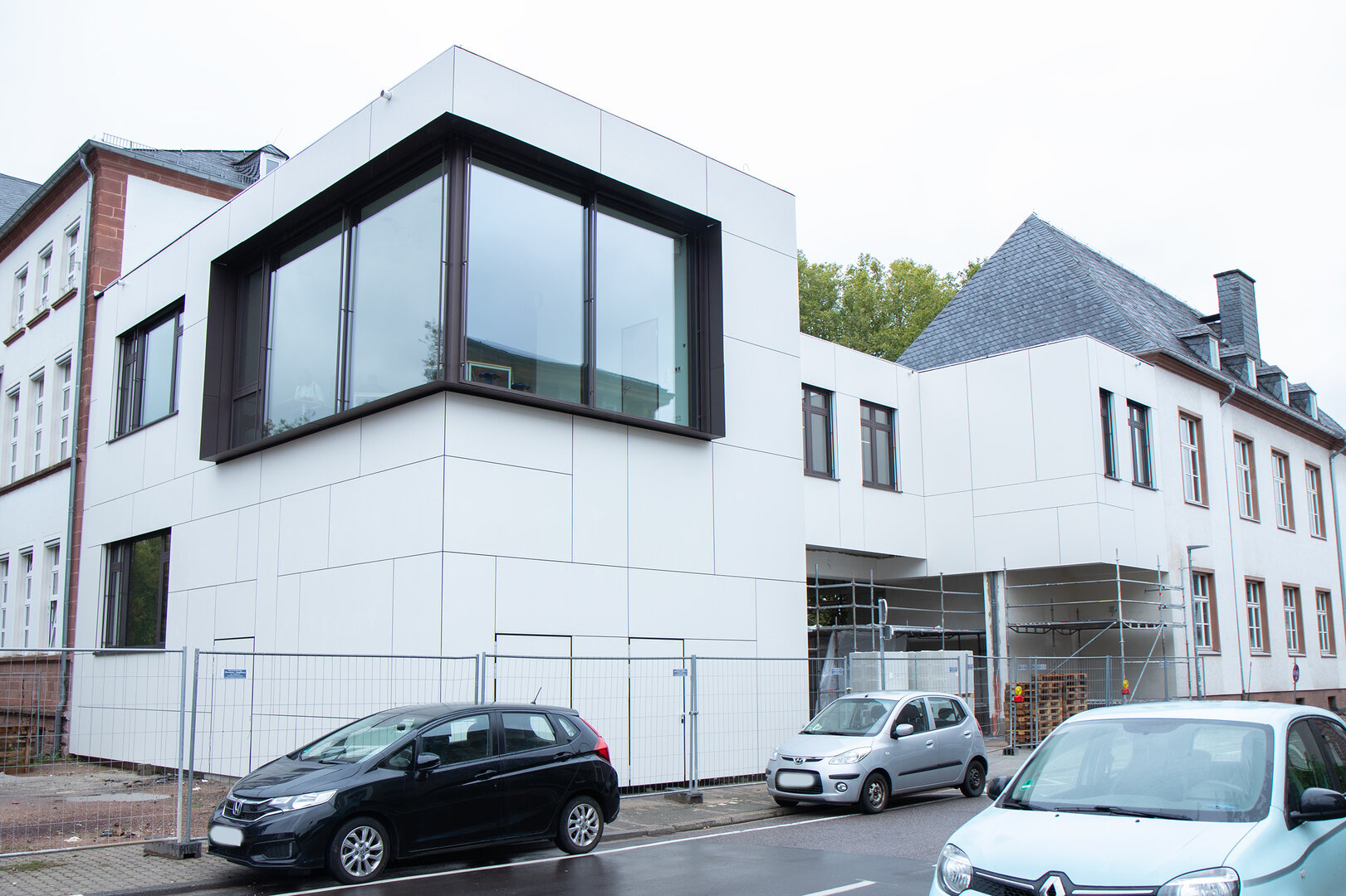 Außenansicht des neuen Anbaus am Robert-Schuman-Gymnasium, hinter der Glasfront befindet sich der neue FGTS-Raum. Foto: Landkreis Saarlouis - David Nicola Schmitt