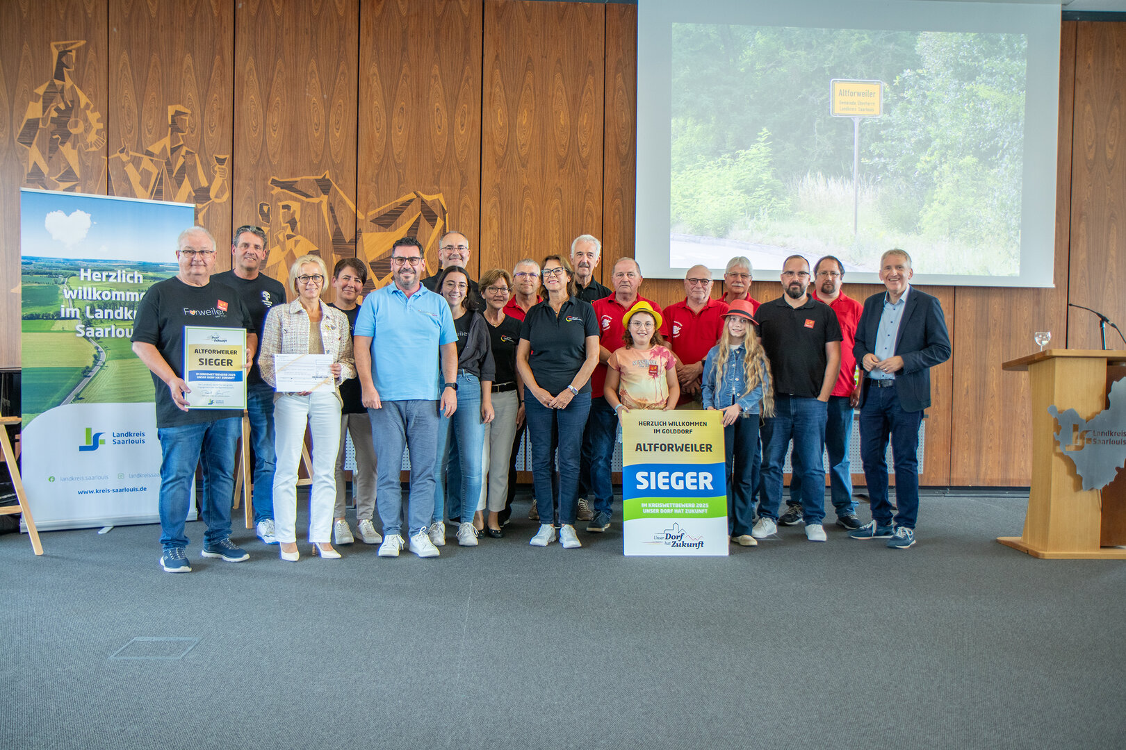 UDhZBei der Abschlussveranstaltung zum Saarlouiser Kreisentscheid von Unser Dorf hat Zukunft war einiges los. Foto: Landkreis Saarlouis - David Nicola Schmitt. Mit Blasmusik und Tanzdarbietungen ging es bei der Abschlussveranstaltung zum Kreisentscheid von „Unser Dorf hat Zukunft“ im Saarlouiser Landratsamt kürzlich schwungvoll zu. Rund 130 Personen nahmen an der Feierstunde im Großen Sitzungssaal teil. Im Beisein der Bürgermeisterin und Bürgermeister der beteiligten Gemeinden, Ministeriumsvertretenden und Landtagsabgeordneten erhielt die Preisverleihung einen festlichen Rahmen. Neben der Verleihung der Siegerplaketten an die sogenannten „Golddörfer“ Reisbach und Altforweiler wurden auch Sonder- und Teilnahmepreise vergeben. Das Programm wurde von den Tanzmariechen der „Aschbacher Narrekäpp“ und den „Blechbanausen“ des Musikvereins „Harmonie“ Gresaubach mitgestaltet.