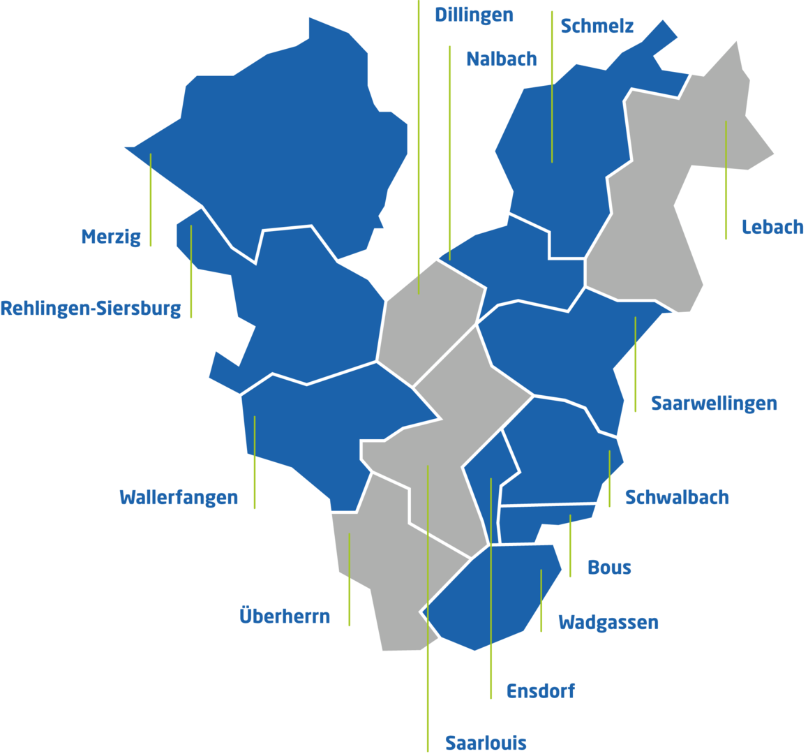 Karte der teilnehmenden Kommunen im Landkreis Saarlouis und Merzig an der Zentralen Vergabestelle Auf der Basis einer öffentlich-rechtlichen Vereinbarung über die gemeinsame Errichtung und Nutzung einer Zentralen Vergabestelle werden seit dem 25. August 2023 neben eigenen Vergabeverfahren auch die entsprechenden Vergaben für neun kreisangehörige Kommunen begleitet und durchgeführt.